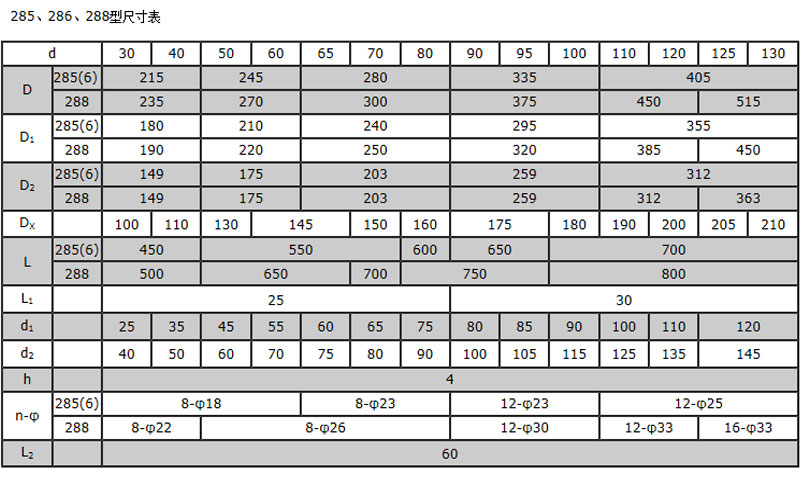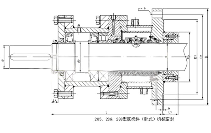 285, 286型机械密封,包括转轴支撑系统及双端面机械密封。 285型适用于1.33×10-5~0.6MPa ,286型适用于1.33×10-5~1.6MPa。密封腔温度≤80℃,转速≤500rpm,实际高度(L,L0等)随搅拌轴伸出长度有些变动,请用户设计时注意,并可根据用户底法兰具体尺寸供货。
